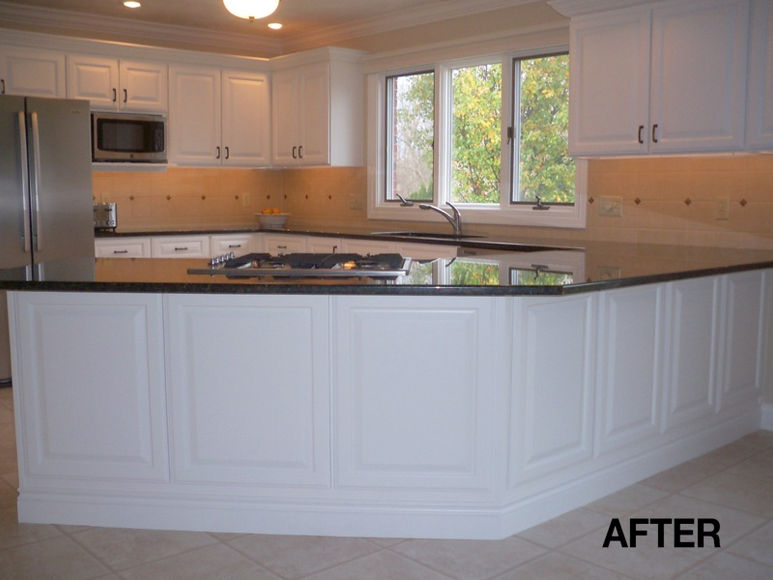 Notice the back of the island we added decorative panels to dress this Kitchen up. The After is Fresh, Clean, and no longer Dated and dark!
